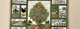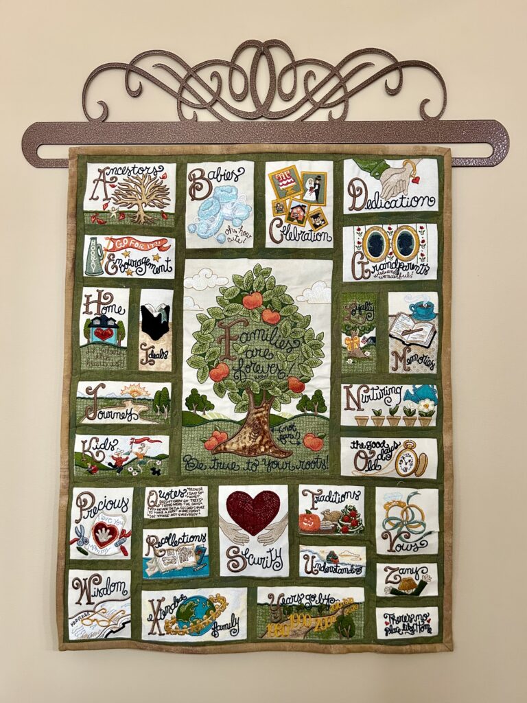 I remembered I had another kinda green WIP that’s been hanging around for a while. The blocks were all sewed together & I had started hand quilting it months ago but the embroidered blocks are so heavy that the sashing doesn’t hold them. I unpicked & left it. On Saturday, I bought some green thread & did some FMQ with my machine in the sashing in one sitting, made & sewed on the binding, then three TV evenings got it tacked down. So this project begun in 2021 is done & hanging on the wall. I ordered a hanger as soon as I finished quilting & it got here at the same time as I finished binding. Win!