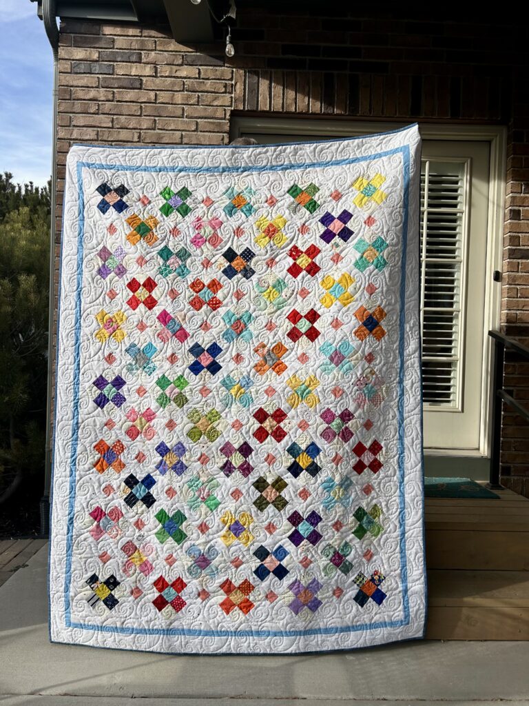 The colors are more vibrant IRL, but you may recall this “County Fair” quilt by Amy Smart from the book, “Scrap School”. It was an RSC2025 project, so you saw the blocks come together. Well, it’s done & I may have a hard time gifting it because I really love it. My quilting partners say I have a big enough house to have quilts everywhere! Hmm. Maybe so……