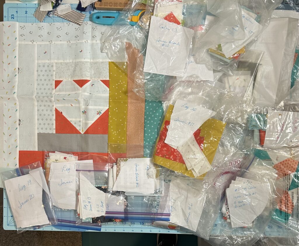We are almost done with our current project of a flag quilt & last week we were discussing our next project. For the first time in all our years of sewing together, we are NOT going to make our own versions of the same pattern. Instead, we are all going to do a previously started kit or project of our own. I thought about what I wanted to do & picked this. I’ve spent the week substituting some other 6.5″ blocks so that there aren’t any duplicates from the original pattern, cutting the center blocks, adding them to bags with the previously cut logs & labeling them so I know what I’m doing. Each week, I can grab a bag, work on a block & get ‘er done!