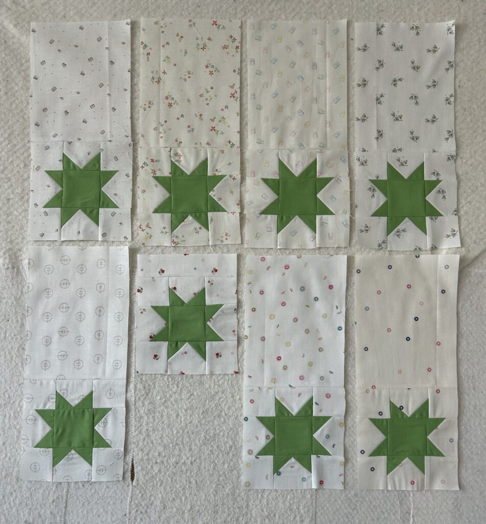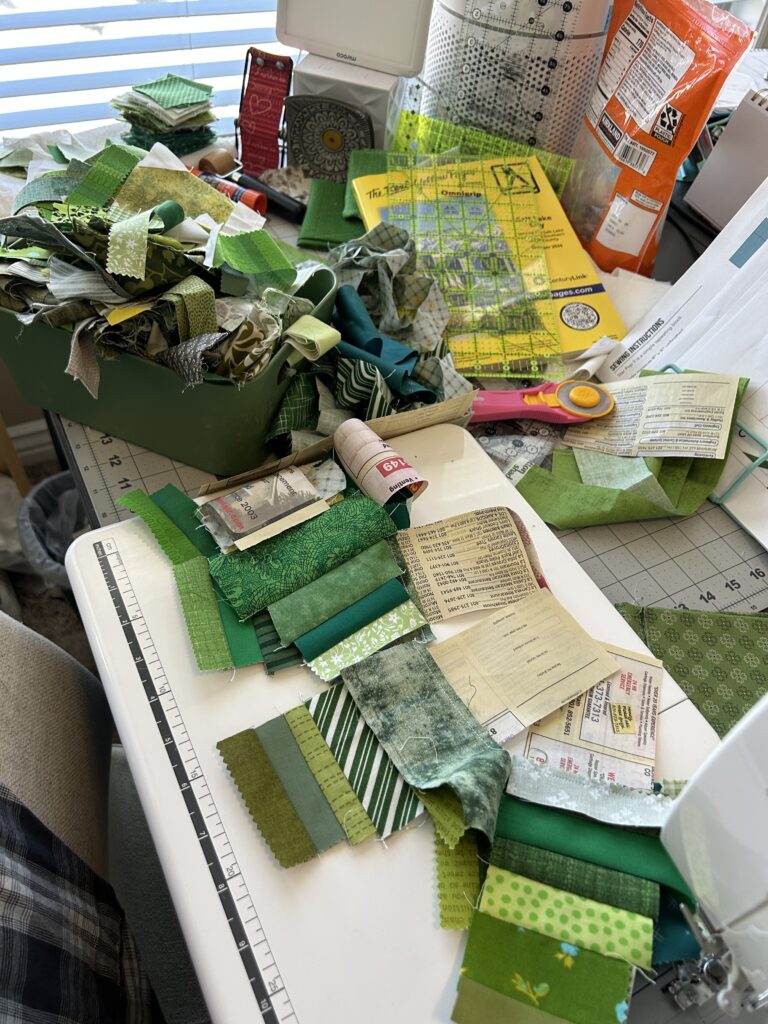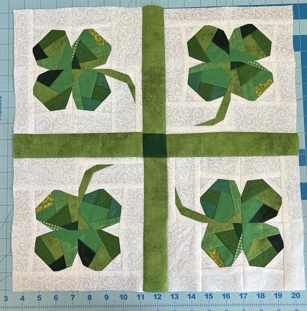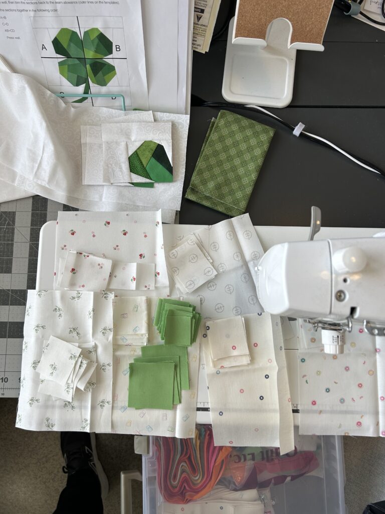 I got all the pieces cut for my Starlets blocks & they will have to be sewed up today, the last day of green February. At the top you can see the FPP I started last week. I made the 4 A quadrants & still need to make B, C, & D then sew them into 4 shamrocks & turn them into a mini quilt for March.
