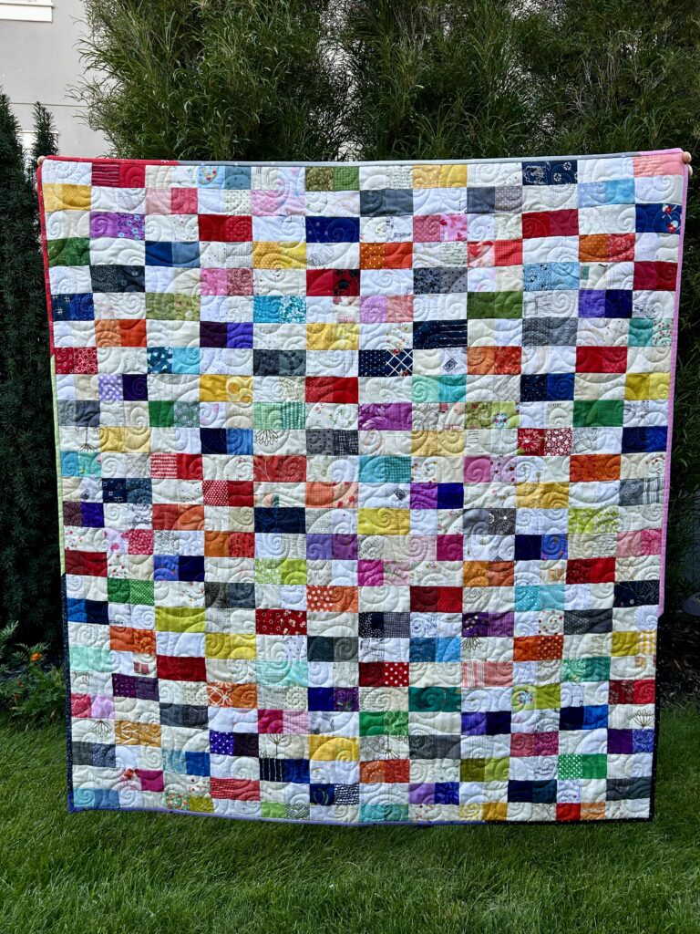 If you need a fun L&E project with no stress, this is all 2.5″ squares. Two are the same color, two are scrappy low volumes, then the 2-patches are sewed together. That’s it. I laid it out scrappy, but it could be ombre, rainbow, monochromatic, so many fun ways to make this quilt.
