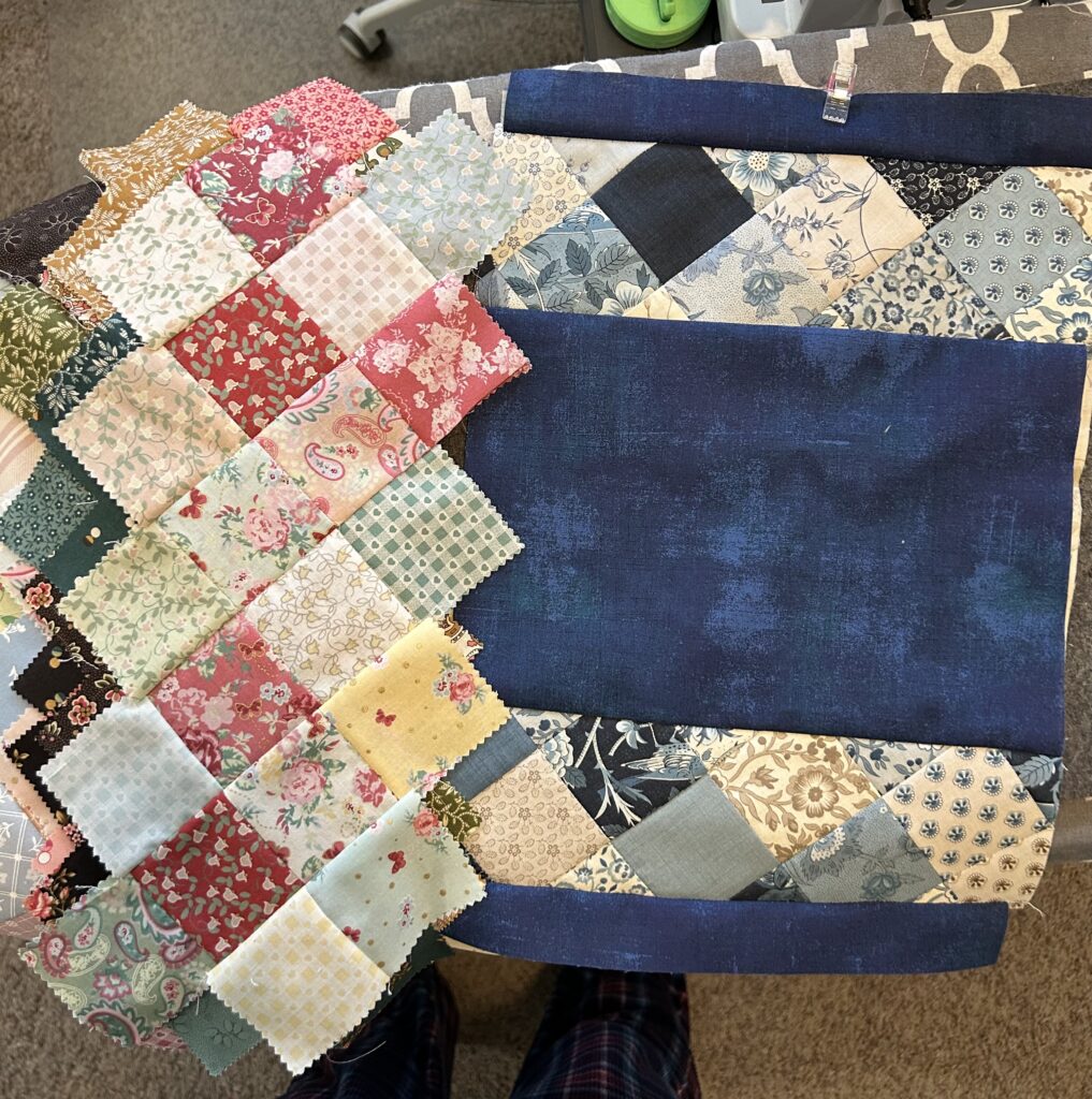 It’s finished with a scrappy binding, made from leftovers of other bindings. This is an RSC2024 project called Two-Step from Lissa Alexander’s book “Scrap School”. Of my 6 projects for last year, I’ve finished 3, have 2 quilted & waiting for binding, & the 2.5″ rail fence blocks spilled into a project for this year. So I feel pretty good about progress. This is not to say that there aren’t projects from previous years still hanging out, but ya know……..