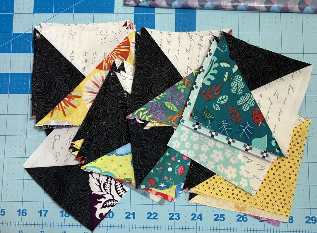 My long-time Thursday quilt group started a new project this week. We “finished” the quilt from h*$# two weeks ago, but we have to put the borders on ourselves at home. I haven’t pulled it out to finish because I can’t stand the thought. The pattern writing was such a nightmare, it was a chore every week. And the blocks don’t fit together, blah, blah, blah. I’m in no hurry to finish & I have quilt tops hanging in the closet waiting for quilting, so no rush. This is “Clippings” by Thimbles & Needles & we are doing it all from our stashes. I found large chunks of the black swirl & the LV equations/writing that is backing trimmings. I love this & have used it for several backings. Then I went through my stash & cut up all the wild prints into 5″ squares, then 2.5″ squares, then into the string bin. So lots of old fabric got processed into usable pieces & out of my big boxes & the mental guilt box of not using it. YAY! I may end up making another one next year with all the leftover colored triangles & donate it. It seems like a perfect RSC2026 project.