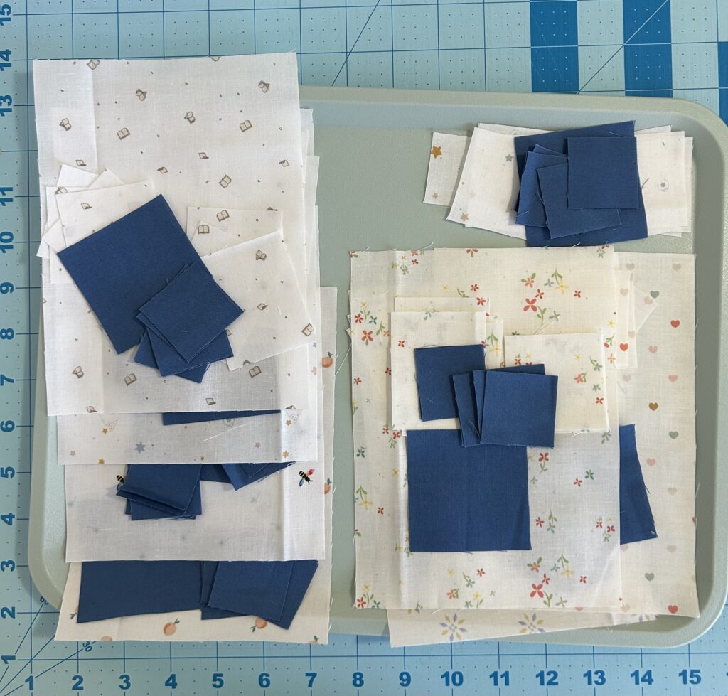 This is what I’ve spent most of my sewing time on this week. I started the Riley Blake QAL From Our House last year by cutting all the strips for the 20 log cabin blocks in January. I made the first 4 alternate designer 6.5″ center blocks & put together 1 whole block. That’s in the upper left. I became disenchanted with the alternate blocks & it got left behind as a WIP. I really like the pattern & want to finish. Inspired by my continual harping about getting WIP’s done, my quilting partners have been sewing up their purchased kits during their personal sewing time.