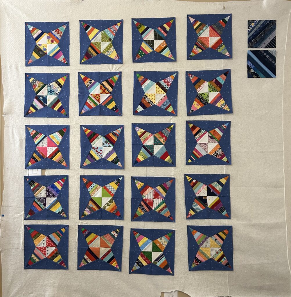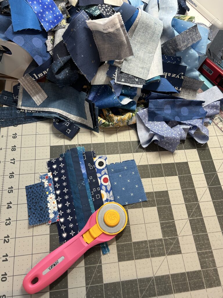 We are almost done with our current project of a flag quilt & last week we were discussing our next project. For the first time in all our years of sewing together, we are NOT going to make our own versions of the same pattern. Instead, we are all going to do a previously started kit or project of our own. I thought about what I wanted to do & picked this. I’ve spent the week substituting some other 6.5″ blocks so that there aren’t any duplicates from the original pattern, cutting the center blocks, adding them to bags with the previously cut logs & labeling them so I know what I’m doing. Each week, I can grab a bag, work on a block & get ‘er done!