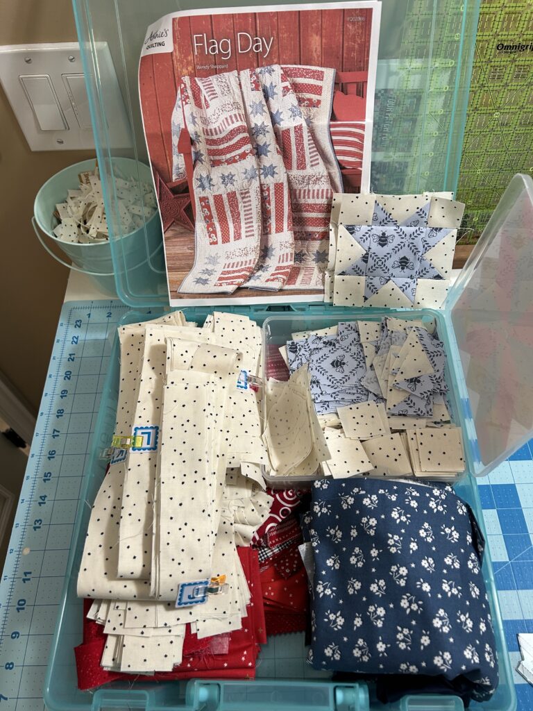 In my long-time quilt group, we are now working on a flag quilt that has 3 shades of blue stars by a block of red stripes. I tried to do it all from my stash, but couldn’t collect enough matching background, so bought yardage for that, although red & blue were already here. We need 20 of each blue shade, so the first set of stars is done! These are my light blue, then I’m doing a medium & a dark star.