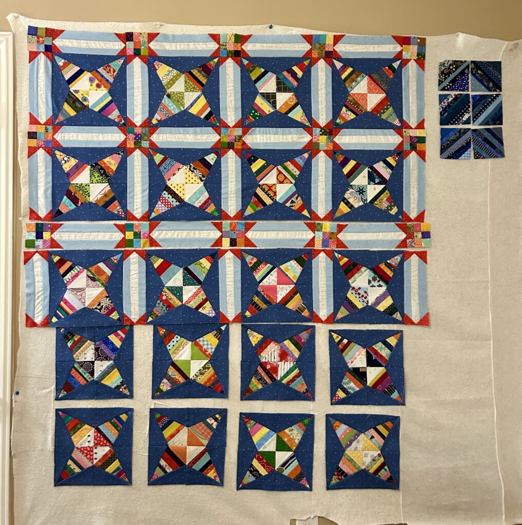 This is what I’ve spent most of my sewing time on this week. I started the Riley Blake QAL From Our House last year by cutting all the strips for the 20 log cabin blocks in January. I made the first 4 alternate designer 6.5″ center blocks & put together 1 whole block. That’s in the upper left. I became disenchanted with the alternate blocks & it got left behind as a WIP. I really like the pattern & want to finish. Inspired by my continual harping about getting WIP’s done, my quilting partners have been sewing up their purchased kits during their personal sewing time.