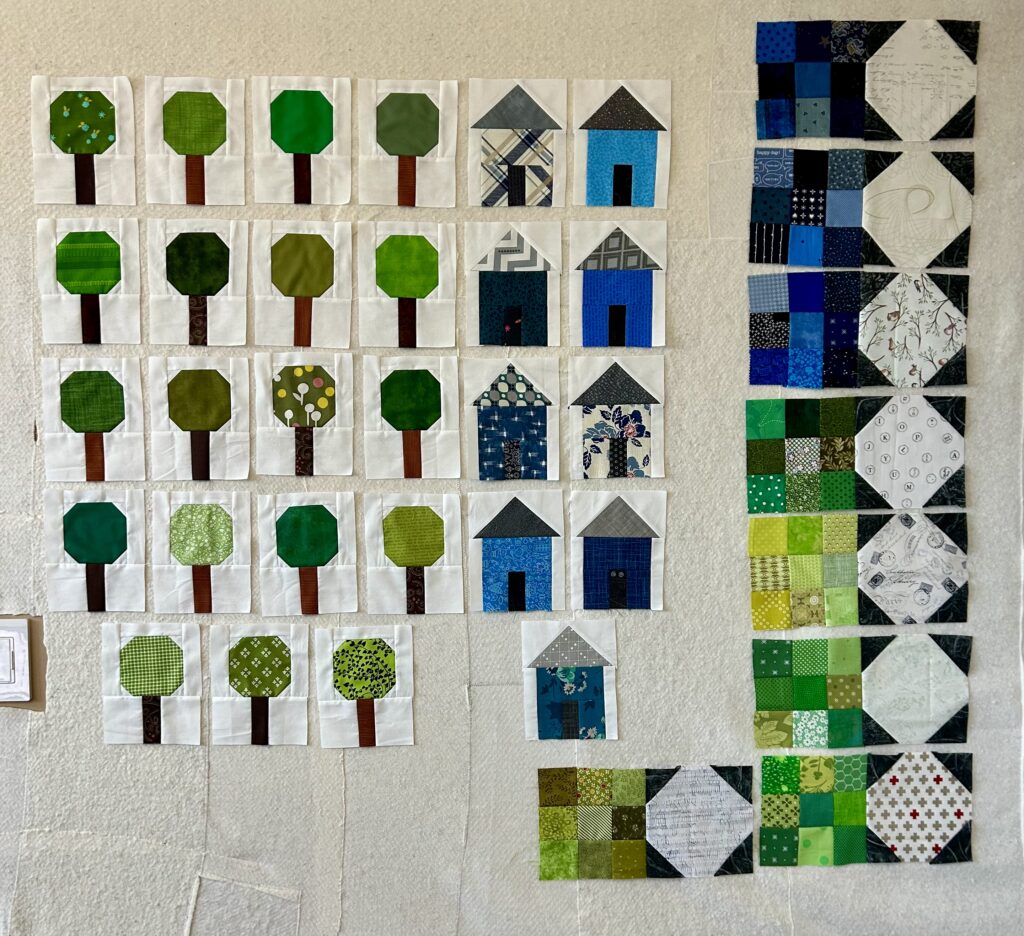 This has been a successful green month so far. With my monthly WIP finished, I concentrated on some of the other projects. I’m doing Our Town by Material Girl Quilts for the Quilter’s Cove QAL. It’s a free pattern from Covid days when everyone was making little house quilts. I didn’t get the January blue houses done, so made 9 this week. I’m going with scrappy gray roofs & black doors for all the houses & using up charm squares, as this is a charm square friendly pattern. Ditto for the 19 trees required, which is my green for the month. There will be no green houses, because…….green trees.