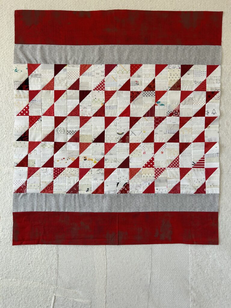 With all my March blocks done, I looked at red in the studio. I found these leftover block parts from Cherry Crunch & found that if I made a few more white string blocks & then snowballed the others, I could have a baby donation with some borders. So this is ready for my quilting partner to do her magic & then get it donated to Joyful Welcome.