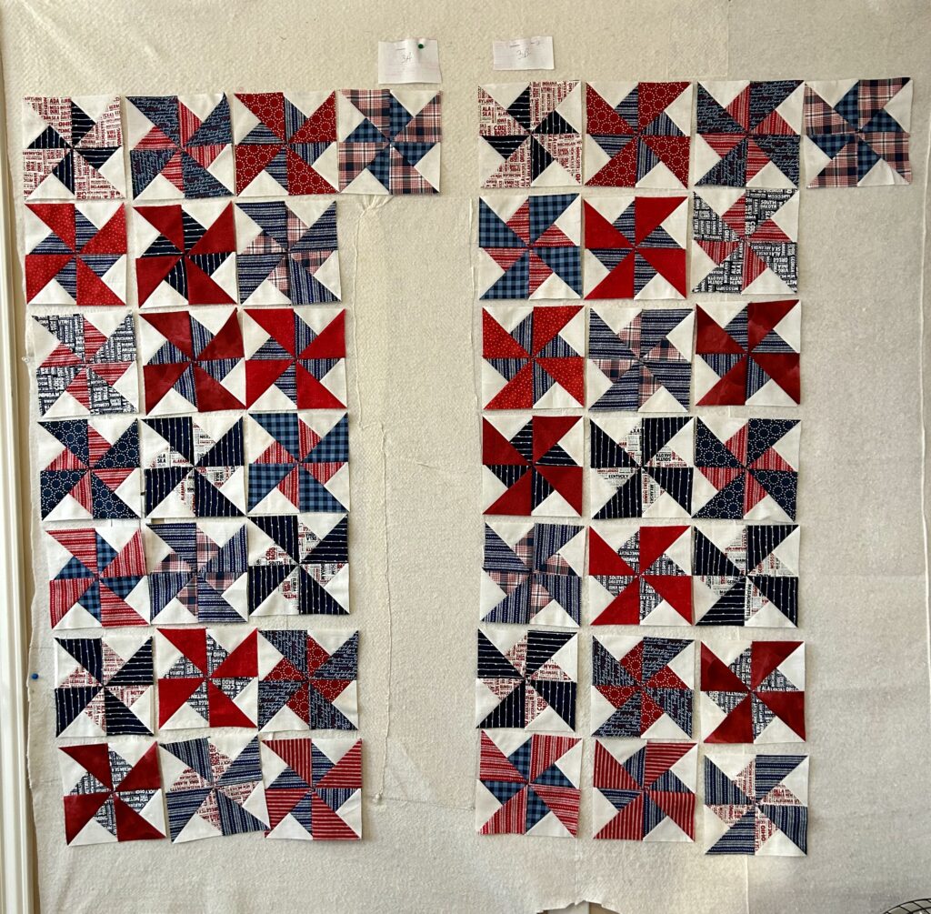 These MSQC pinwheels were begun as an L&E project a couple of years ago. I pulled out the box & found that I had sewed some of the layer cake sections ready to cut into 8-at-a-time HSTs & finished 3 blocks. Many 5″ squares were cut to add to the HSTs, although as I’m working, I see that I will need to dig into my RWB drawer & cut more. But I spent quite a while this week churning out pinwheels & throwing them on the wall. The process makes mirror wheels so each row will spin in opposite directions, which is why I have 2 columns to keep things separate. I may keep working on these or jump into the new color. Who knows?